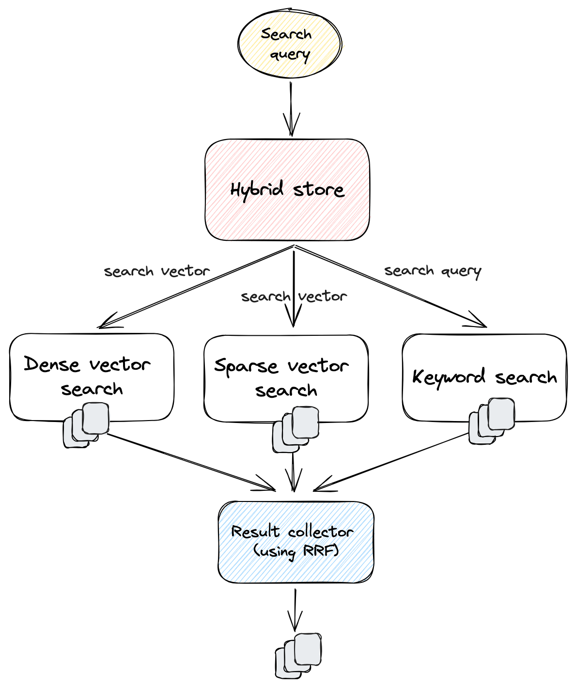 The interesting part is that our hybrid search store itself implements the DocumentStore interface. This means that, from the perspective of the caller, it doesn't matter whether they are interacting with a single store or our complex hybrid store — they use the same interface and methods. This design ensures that all of the logic for determining which documents are retrieved is hidden from the caller and can be tested separately. To implement the hybrid store, we passed in multiple child document stores and parallelized the search across all of the child stores.