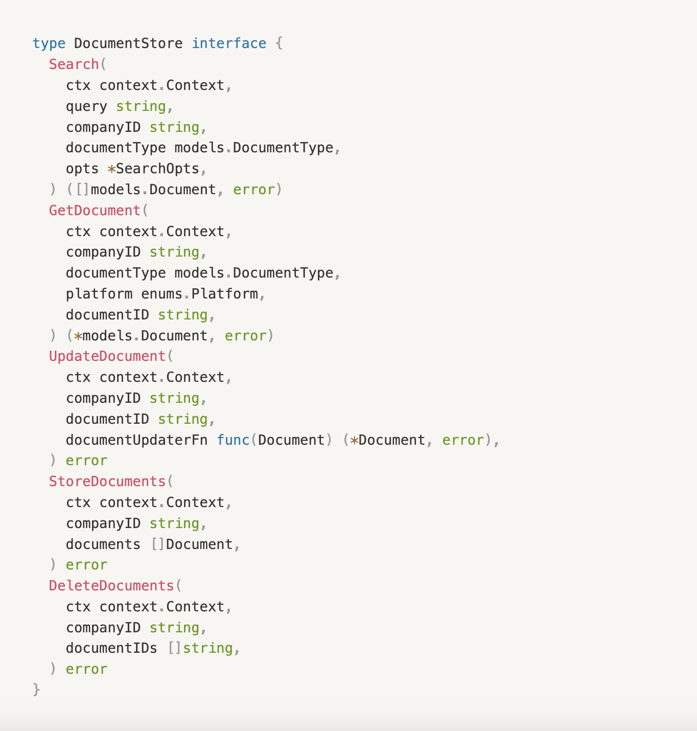 To enable a hybrid store solution, we developed a document store abstraction in our code, allowing us to integrate multiple search algorithms. The abstraction is simple but captures all the essential functionalities of a document store and search system. It handles document management and querying and is agnostic to the actual implementation (vector search, keyword search, etc.). Here’s what it looks like: